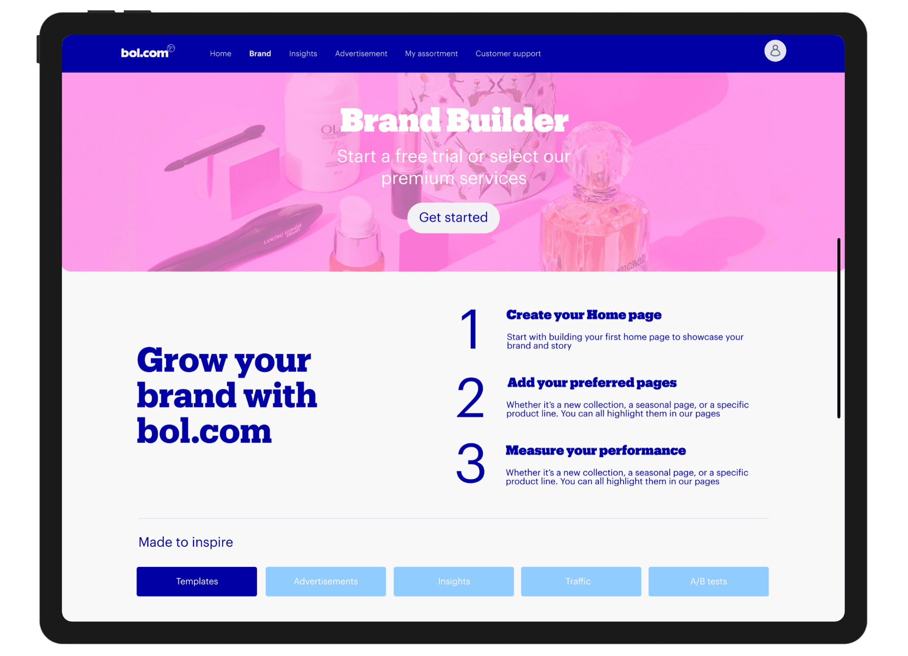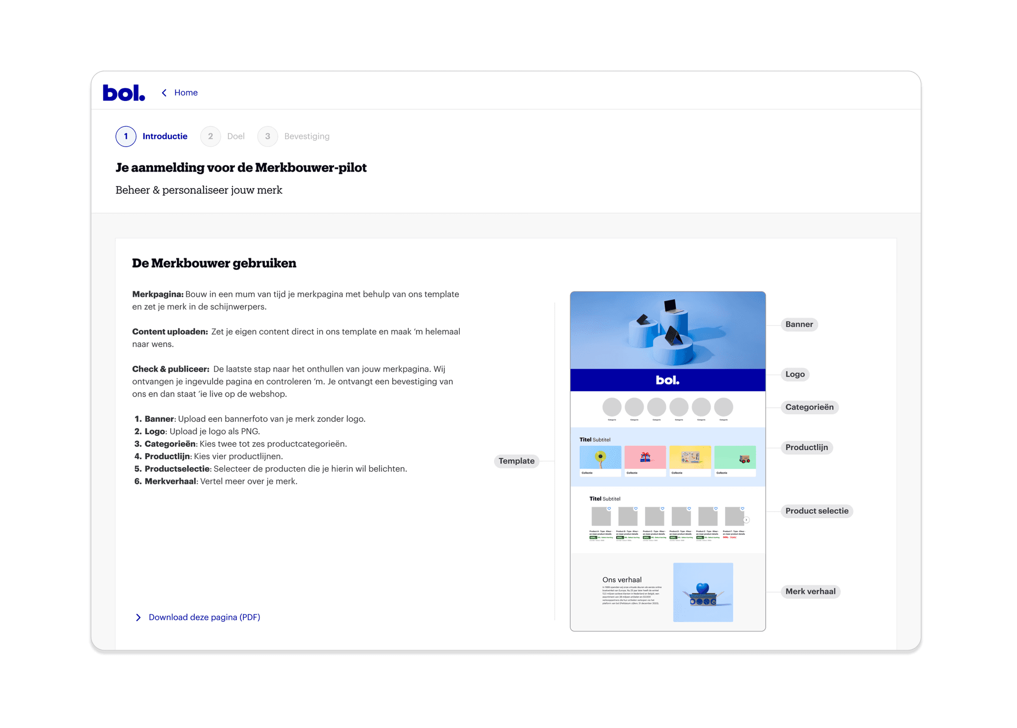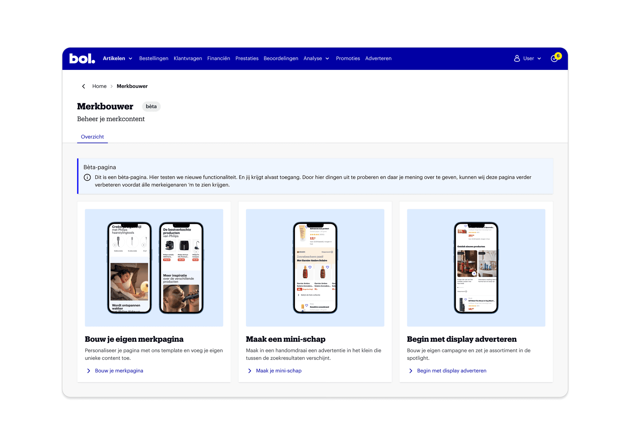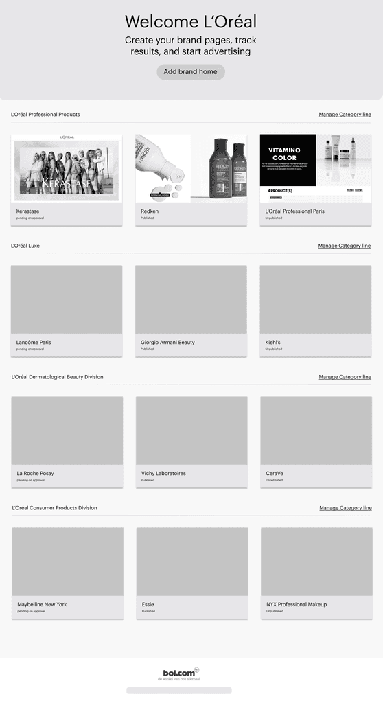Brand owners (partner type) don't have the possibility to showcase their brand on bol. Only selected partners can do this via their account managers. There was very little known about the brand needs, yet this target group is very interesting for bol.'s revenue stream. Therefore, my challenge was to find a product market fit for brand owners. This project started with only me as Senior Product Designer and a Group Product manager. After one quarter, the brand needs were clear, and we discovered different brand types in collaboration with data. Then followed another quarter with concept designs, testing, and stakeholder management. After this, we got one PM and an engineer to start with the first experiments.